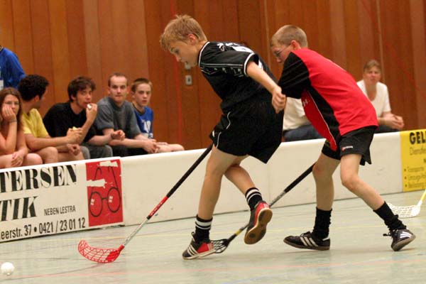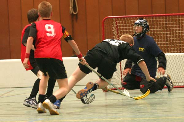 U14-DM, Spiel 3, Gettorf gegen Allensbach. Vergleiche zwischen zwei Regionen sind immer schwer vorherzusehen, eine deutliche Favoritenrolle geht sehr selten klar im Vorneherein an ein Team. Gettorf erwischte den besseren Start und erzielte in der 3. Minute den ersten Treffer. Zwar glich Allensbach aus, aber in Folge schien Gettorf doch das etwas bessere Team: zwei schöne Kombinationen und ein sicher abgeschlossener Konter - bis zur 13. Minute zogen die Norddeutschen auf 4:1 davon. Allensbach war allerdings keineswegs chancenlos und konnte zwei Minuten vor Schluß seinen zweiten Treffer verdient erzielen.